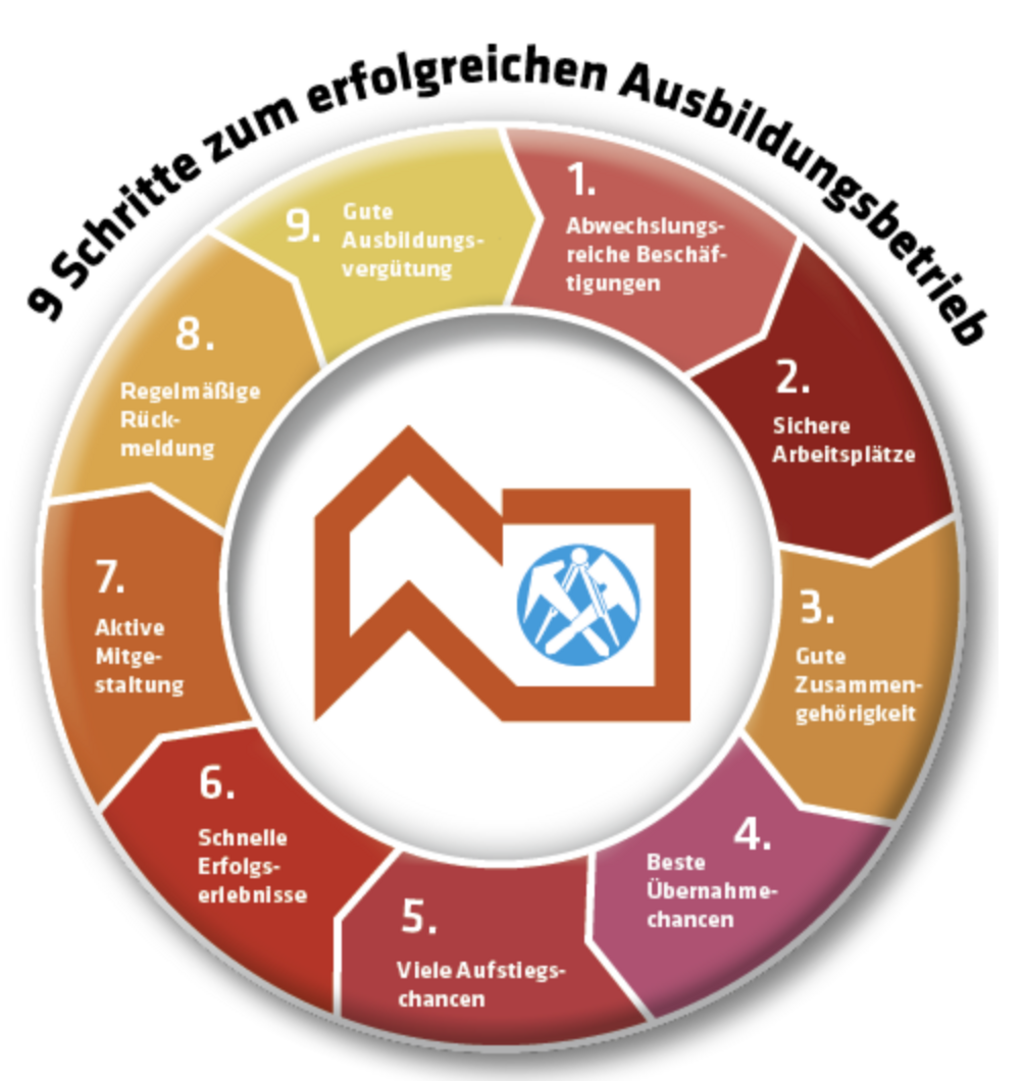 Betriebe, die das Ausbildungsversprechen abgegeben haben, verpflichten sich, neun Punkte während der Ausbildungszeit einzuhalten, damit Du den größten Mehrwert aus Deinen Lehrjahren ziehen kannst. Du erkennst sie an unserem Symbol und stellst damit sicher, dass Du eine besonders gute Ausbildung erhältst.
